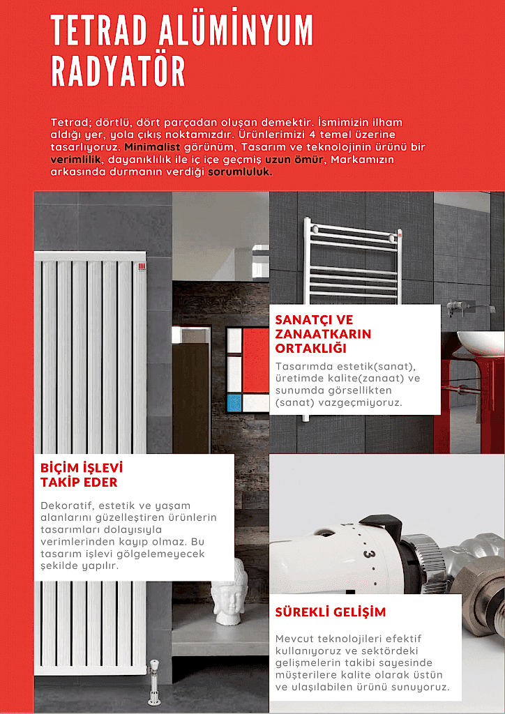 Tetrad® olarak, kurumlara ve bireylere yönelik sunulan alüminyum radyatör, havlupan ve aksesuarları konularında Türkiye’nin önde gelen firmalarından olmak en büyük hedefimizdir. Tetrad® en son teknolojileri kullanarak, yenilikçi ve uzmanlaşmış kadrosu ile sektöre katkı sağlamayı hedeflemektedir. Sürekli geliştirme felsefesi ile müşteri memnuniyetini mümkün olan en üst düzeye çıkarmak, iş ortaklıkları kurmak, sosyal sorumluluk projelerinde yer almak, müşterilerimiz ile iyi diyalog geliştirmek hedeflerimize ulaşmamızdaki başarı noktalarımızdır.